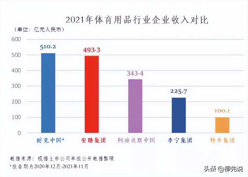 国内体育用品行业企业收入榜第1是耐克中国,去年营收为510.2亿元人民币,只以微弱的优势赢了安踏。耐克品牌签下的大牌代言人包括乔丹、C罗、勒布朗·詹姆斯等。有分析师指出:“过去一年里,国际运动品牌在华的表现并不理想,除了材料和运输成本的影响之外,最核心的原因还是国货的崛起。近两年,国产运动产品逐渐在市场上占主导地位,此消彼长之下,耐克、阿迪霸占市场的现象早已不复当年。”