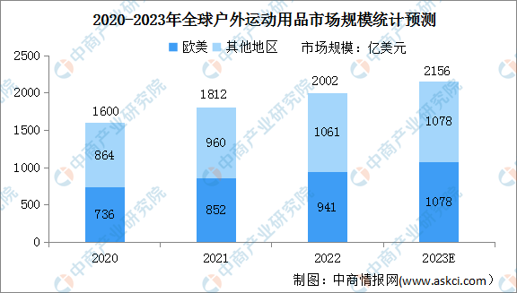 近年来,全球户外运动用品市场规模高速增长,由2020年的1600亿美元增至2022年的2002亿美元,年均复合增长率11.9%。全球户外运动用品市场增速预计放缓,但规模仍将稳步上升,预计2023年全球户外运动用品市场规模将达到2156亿美元。