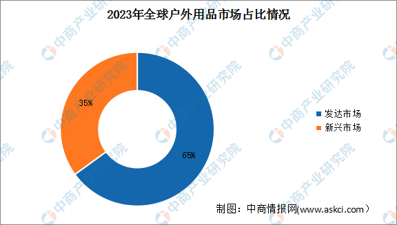 预计至2023年,发达市场仍是全球户外用品市场的主流,占比高达65%;新兴市场约占据全球户外运动用品市场约35%的份额,未来有望进一步增长。