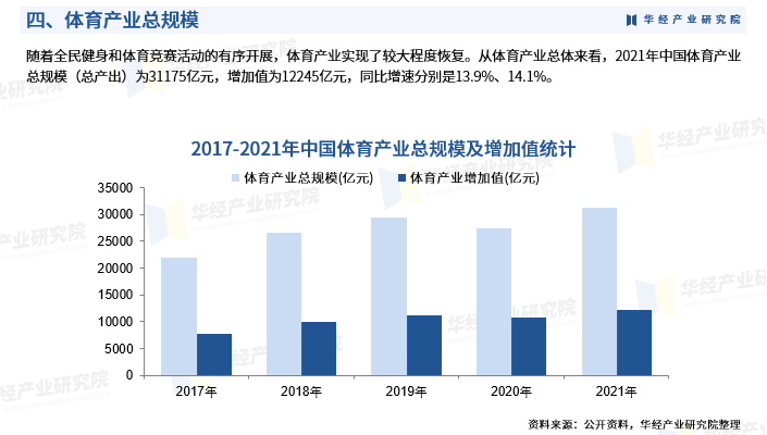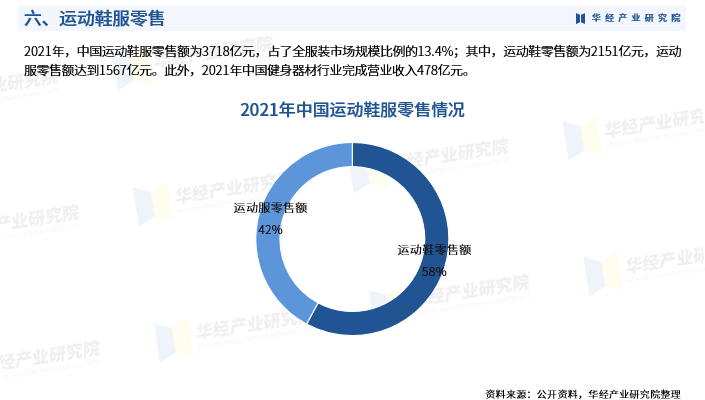 随着全民健身和体育竞赛活动的有序开展,体育产业实现了较大程度恢复。从体育产业总体来看,2021年中国体育产业总规模(总产出)为31175亿元,增加值为12245亿元,同比增速分别是13.9%、14.1%。受益于消费者健康意识的提升,中国体育用品行业也随之发展。据国家统计局数据,2021年中国体育用品及相关产品制造业总规模为13572亿元,因2020年基数较低,使得同比增速达10.5%,总规模已回暖至2019年水平。2021年,中国运动鞋服零售额为3718亿元,占了全服装市场规模比例的13.4%;其中,运动鞋零售额为2151亿元,运动服零售额达到1567亿元。此外,2021年中国健身器材行业完成营业收入478亿元。