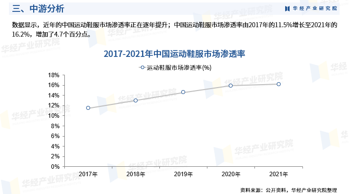产业链方面,体育用品行业的上游主要关于橡胶、塑料、皮革等原材料;中游主体则是运动服饰、健身器材、运动护具等体育用品;下游是体育用品的相关应用场景,包括文娱活动、体育培训、体育赛事等。数据显示,近年的中国运动鞋服市场渗透率正在逐年提升;中国运动鞋服市场渗透率由2017年的11.5%增长至2021年的16.2%,增加了4.7个百分点。