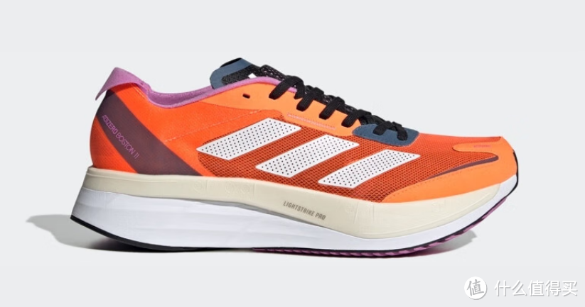 跑鞋类型:竞速鞋适合脚型:正常足、内翻足适合体重:60~80kg中底科技:LIGHTSTRIKE 2.0、LIGHTSTRIKE PRO适合路面:塑胶/柏油/水泥/健身房适用场景:马拉松比赛点评:ADIDAS阿迪达斯ADIZERO ADIOS 8 跑鞋采用全新LIGHTSTRIKE 2.0+LIGHTSTRIKE PRO中底,搭载TORSION RODS 2.0升级抗扭系统,轻盈回弹,稳定反馈全进阶;LIGHTWEIGHT MESH高透气鞋面,轻薄强韧,通风贴合;CONTINENTAL马牌橡胶抓地科技,持久耐磨。