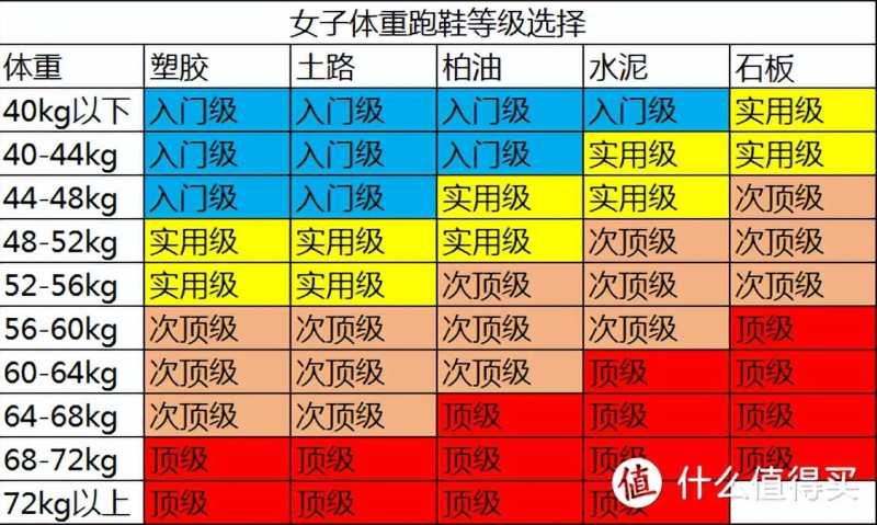 以亚瑟士男子/女子体重跑鞋等级选择表为参考,对于其他品牌也基本同样适用,具体参考详见下图6、7。