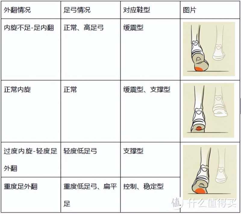 如果跑鞋鞋底脚跟中部和前掌中部磨损都较为明显的话,一般来说属于跑步时有正常内旋的状况,属于正常足;如果跑鞋鞋底整个外侧磨损较为明显的话,一般来说属于跑步时有内旋不足的状况,有足内翻的情形出现,也就是通常所说的内翻足;如果跑鞋鞋底脚跟外侧和前掌尤其大脚趾部位磨损较为明显的话,一般来说属于跑步时有过度内旋的状况,有足外翻的情形出现,也就是通常所说的外翻足。5. 足弓类型、跑步时的内旋状况及其对应跑鞋类型具体参考见下图5: