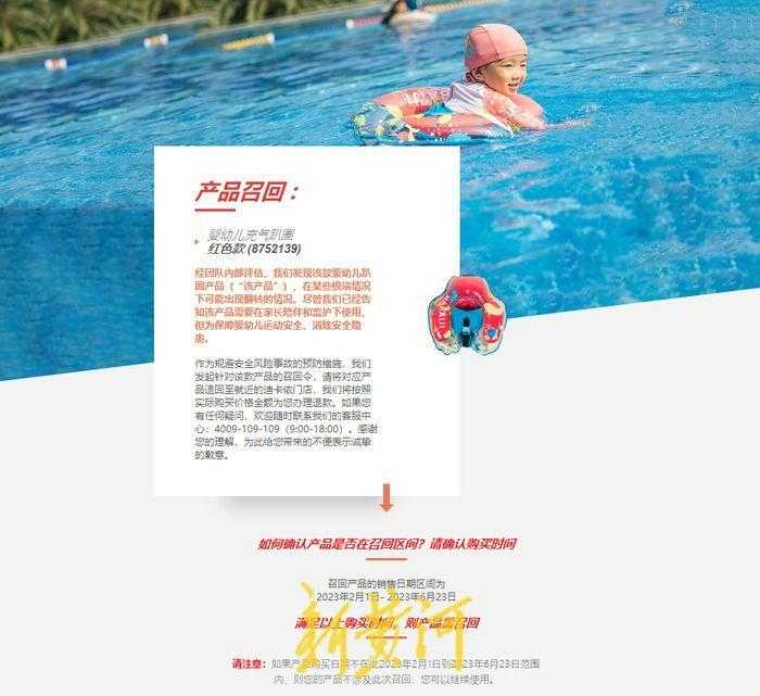 此外,新黄河记者在迪卡侬官网发现,近期新增一则产品召回信息:迪卡侬销售的一款婴幼儿充气趴圈,经内部评估发现“在某些极端情况下可能出现翻转的情况”。召回产品的销售日期区间为2023年2月1日-2023年6月23日。