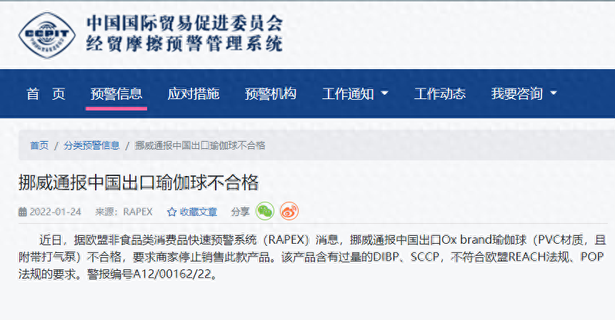[9] 挪威通报中国出口瑜伽球不合格, 中国国际贸易促进委员会经贸摩擦预警管理系统. 2022-01-24. https://yj.ccpit.org/warningInformation/11132/detail