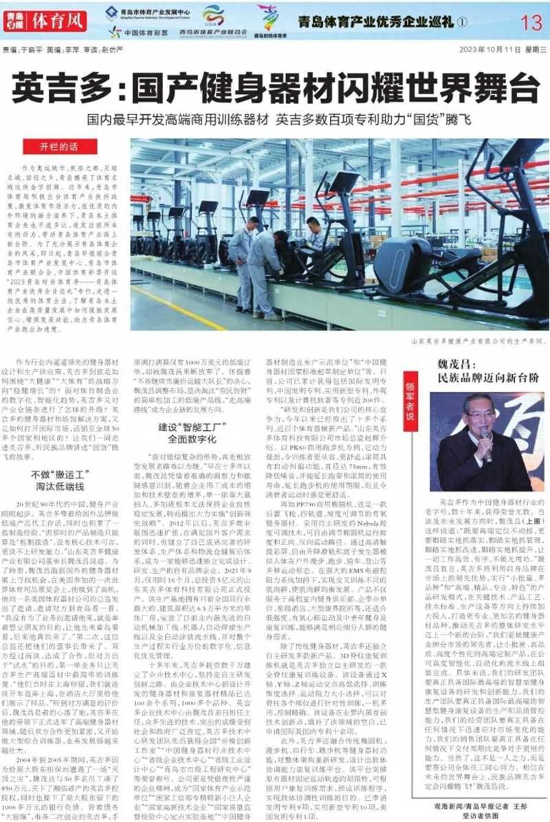 作为行业内遥遥领先的健身器材设计和生产供应商,英吉多到底是如何围绕“大健康”“大体育”的战略方向“稳健增长”的?面对体育制造业的数字化、智能化趋势,英吉多又对产业全链条进行了怎样的升级?英吉多的健身器材和场馆解决方案,又是如何打开国际市场,远销至全球50多个国家和地区的?让我们一同走进英吉多,听民族品牌讲述“国货”腾飞的故事。