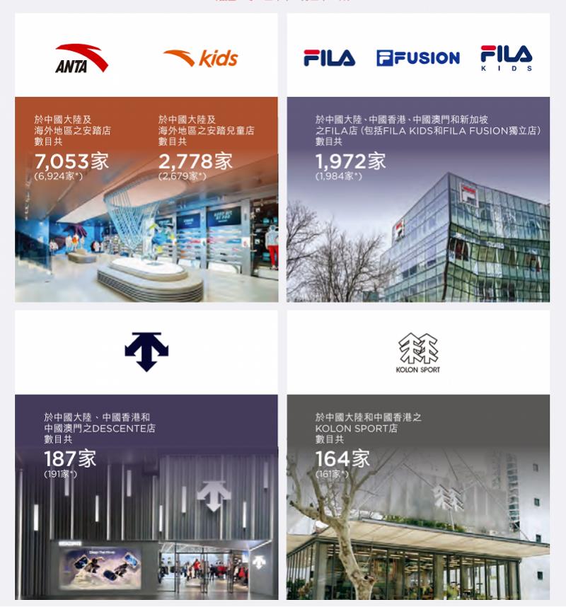 截至2023年12月31日,安踏品牌在中国大陆和海外地区共有7,053间门店,2,778间安踏儿童门店。FILA品牌在中国大陆、中国香港、中国澳门和新加坡拥有1,972间门店,包括FILA KIDS及FILA FUSION独立门店。迪桑特和可隆在中国大陆、中国香港及中国澳门分别有187间和164间门店。