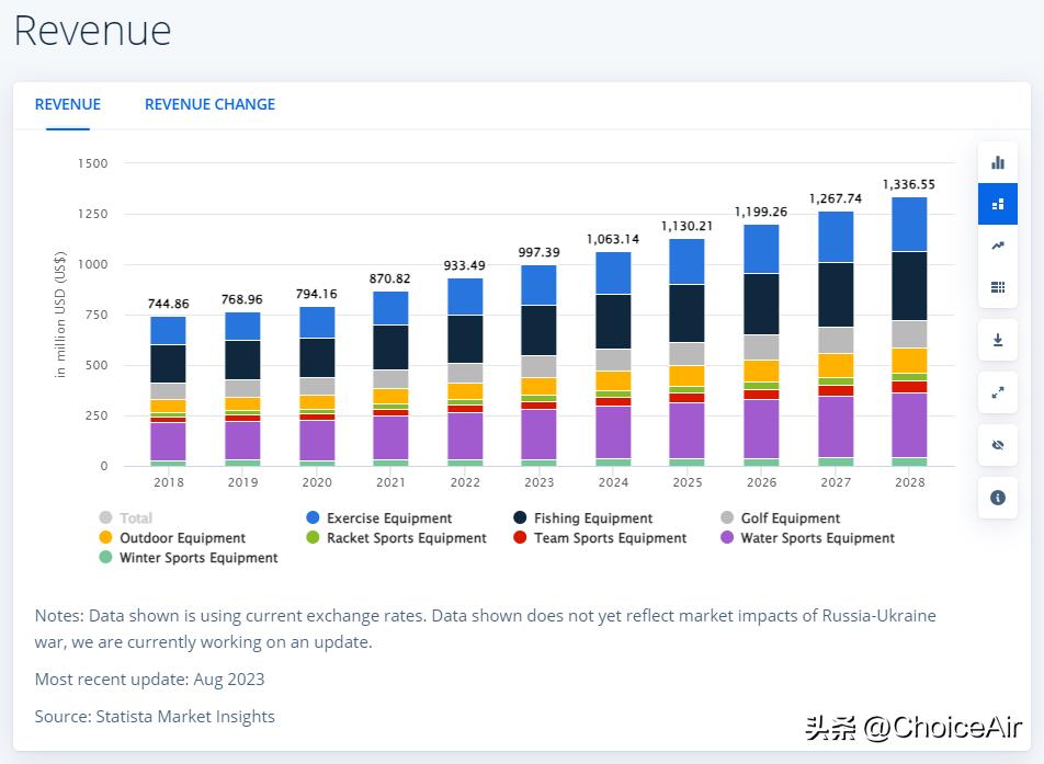 据Statista数据显示,2023年,沙特运动器材市场收入将达到9.97亿美元,预计到2028年,市场规模为13.36亿美元,复合增长6.04%。
