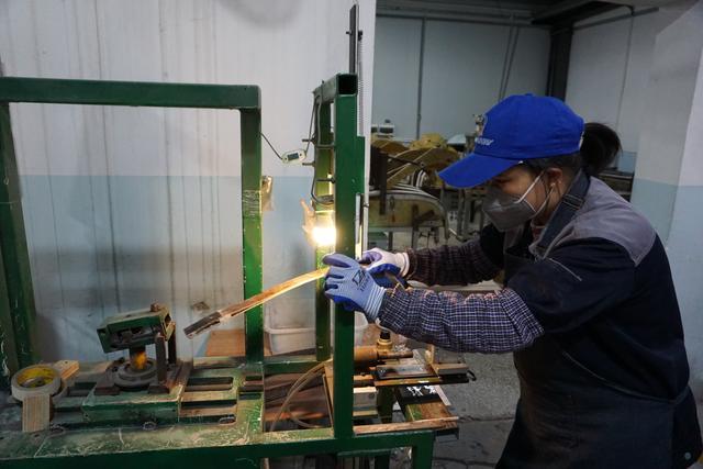 北海鑫琪体育用品制造有限公司车间,工人在调整弓片。