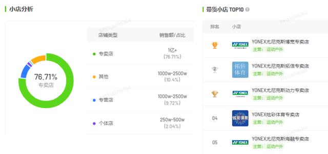 对于小店合作的带货达人,可以看到体育垂类达人数量最多。除了@YONEX尤尼克斯博宽专卖店 官方达人外,羽毛球内容账号的多个达人也为品牌贡献了重要销售表现。
