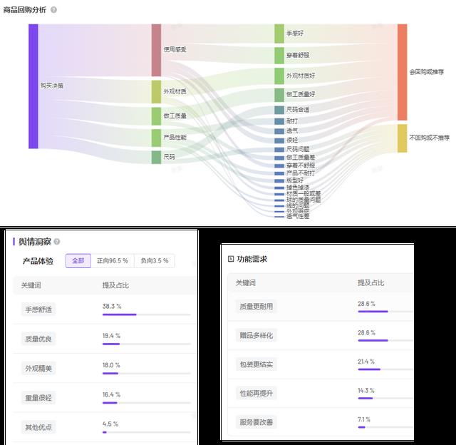 在用户回购原因方面,反馈主要从使用体验(42%)、外观材质(19%)、做工质量(14%)、产品性能(14%)与尺码(11%)5个方面共同构成核心驱动力,其中“手感好、穿戴舒服、外观材质好”是用户正向产品体验的主要原因。