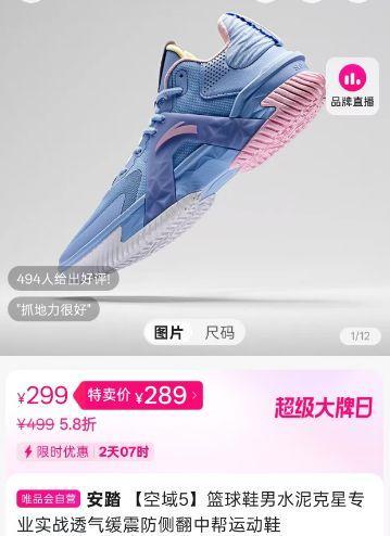 并且就在前不久,安踏就又与唯品会展开深度合作,联合举办的超级大牌日活动。凯里欧文系列、汤普森 KT 系列等篮球穿搭都有限时优惠,力度堪比618。像其中一款安踏空域5篮球鞋,原价499,如今289就能到手,相当于打了5.8折,吸引了不少消费者的抢购。