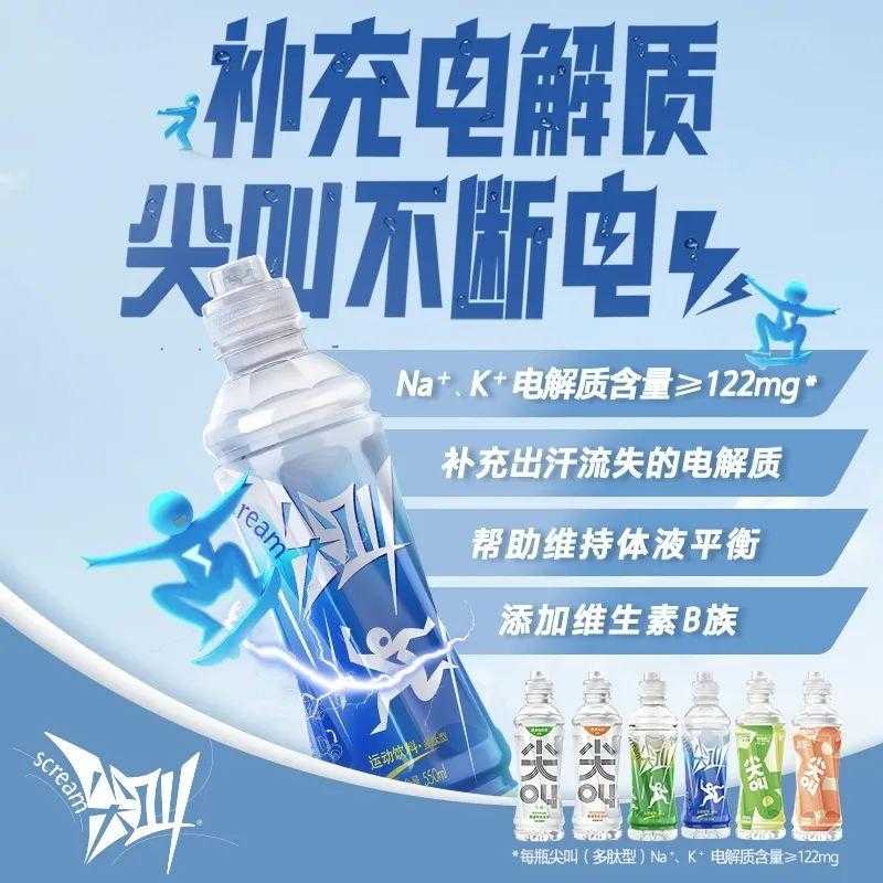 隶属于农夫山泉公司,自上市以来一直坚持在运动饮料细分领域深耕发力,一共有三代产品。第一代分别为植物饮料的红色尖叫(已停产)、多肽型饮料的蓝色尖叫和纤维型饮料的绿色尖叫。该系列产品口味清淡,热量较低,钠含量为30~40mg/100ml,含糖量为5g/100ml,每瓶售价在4.5元左右。