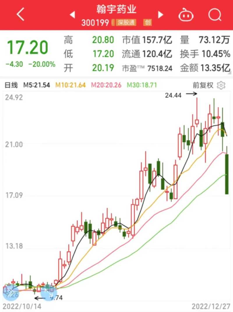12月27日早盘,A股前期大热的抗疫题材出现明显回落。熊去氧胆酸、新冠药、肝炎概念、新冠检测、生物疫苗等题材跌幅较大。熊去氧胆酸、新冠药两大板块跌幅超过4%,热门龙头之一翰宇药业跌停,跌幅为20%,上海凯宝早盘跌逾13%。