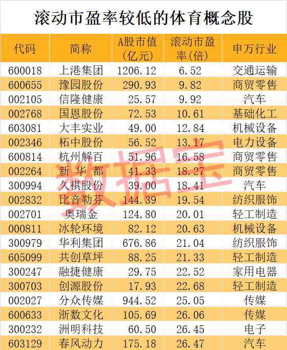 证券时报•数据宝统计,二级市场表现来看,截至12月26日收盘,今年以来体育概念股平均下跌14.39%。仅10股累计涨幅超10%,涨幅靠前的是曲江文旅、国旅联合、牧高笛、贵人鸟、人民网等。目前共10股滚动市盈率低于20倍,上港集团、豫园股份、信隆健康等3股滚动市盈率不到10倍。