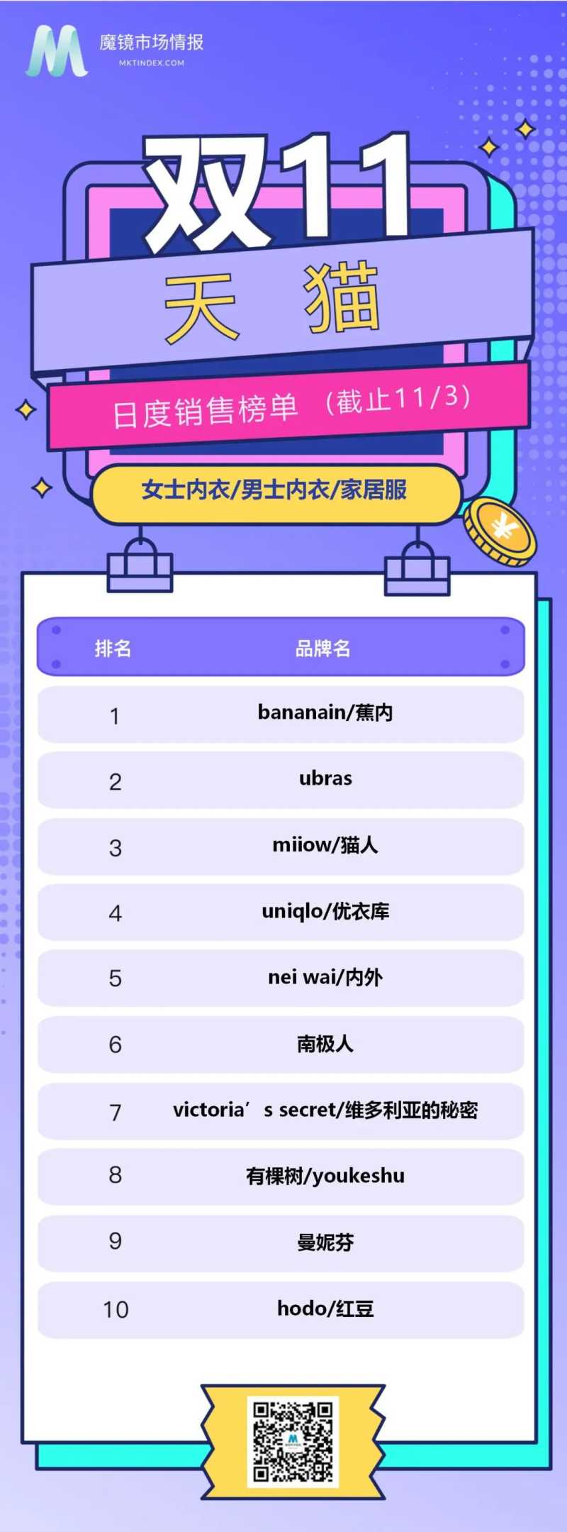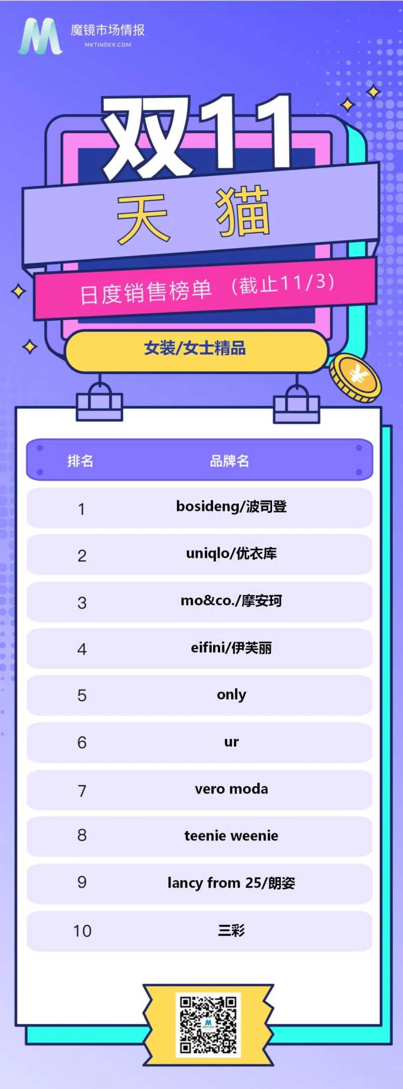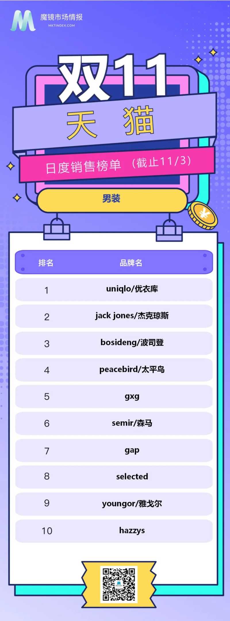 今天,魔镜市场情报为大家盘点一下运动户外、服饰鞋包行业中,天猫平台截至11月3日含预售的累计销售额品牌排行。