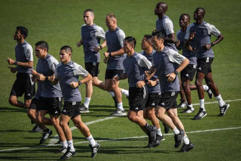 ↑11月18日,中国裁判马宁(前右三)、曹奕(前右二)、施翔(前右一)在官方训练中。