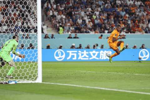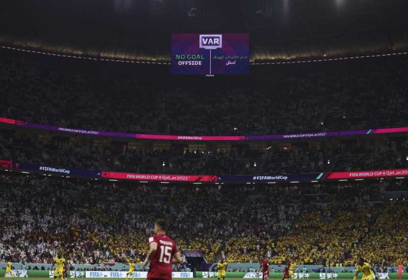 ↑11月20日,赛场内大屏幕上出现VAR(视频助理裁判)最终判罚结果。