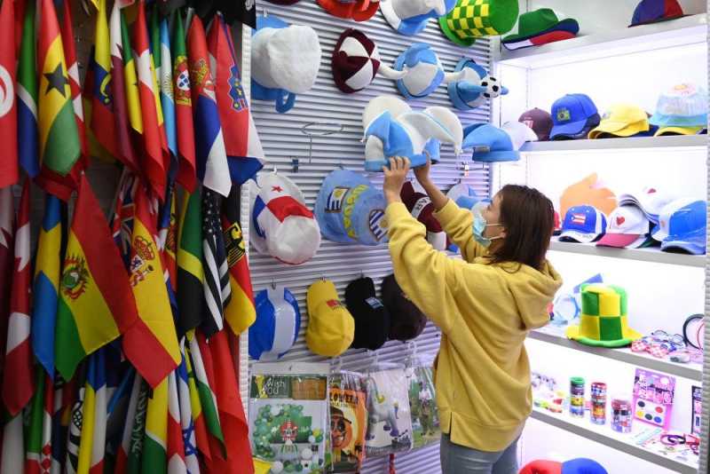 ↑11月17日,在义乌国际商贸城,一家获得官方授权的商户在展示2022年卡塔尔世界杯参赛国家旗帜与周边产品。