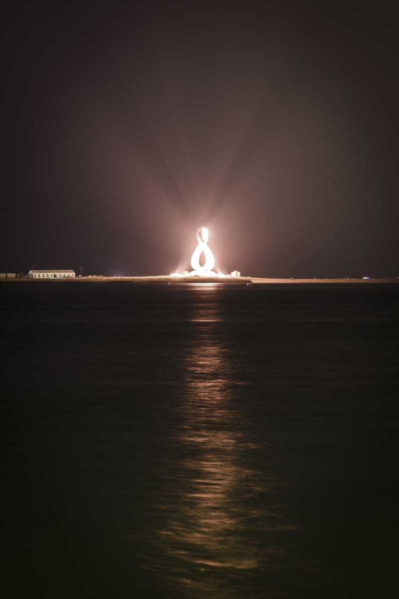 ↑11月19日,在球迷广场启动仪式上闪耀的世界杯会徽雕塑。