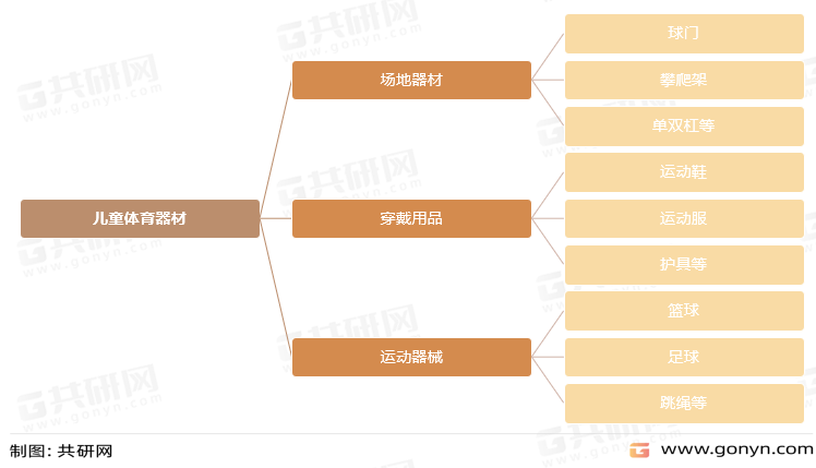 体育运动器材是指竞技体育比赛和活动、健身锻炼所使用的各种器材、场地及设施的总称。体育器材与体育运动相互依存,相互促进。体育运动的普及和运动项目的多样化使体育器材的种类、规格等都得到发展。儿童体育器材是指按照儿童生理特点专门的生产的适用于儿童使用的体育器材,产品种类丰富多样,分类方式也不尽相同。按照应用领域与直接消费者,可以分为学校体育器材、自备器材和其他儿童器材等。一般按照使用方式可以分为场地器材、穿戴用品和运动器械等。场地器材为固定的不可移动体育器材,如球门、篮球架、攀爬架、单双杠等产品,穿戴用品主要包括运动鞋服、帽、护具等产品;运动器械为参与各种运动中所使用具体门类用品,如篮球、足球、球拍、跳绳等产品。