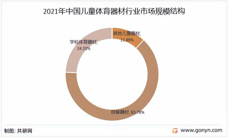 其中,2021年中国自备器材市场规模为1175.8亿元,占儿童体育器材行业整体规模的63.78%,占比最大;学校体育器材市场规模为448.5亿元,占儿童体育器材行业整体规模的24.33%。