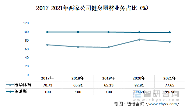 2017-2021年两家公司健身器材业务占比(%)