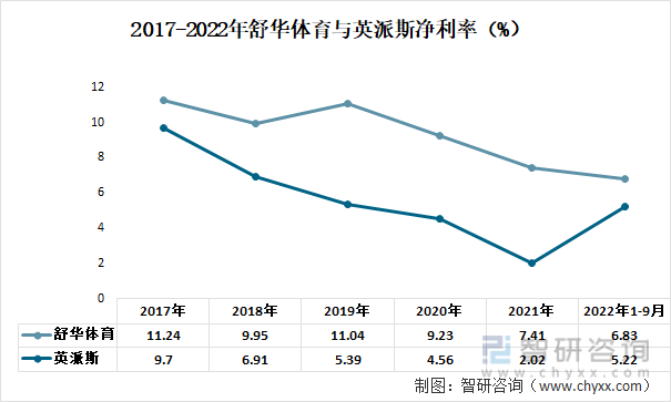 2017-2022年舒华体育与英派斯净利率(%)
