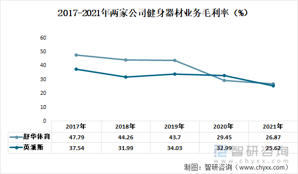 2017-2021年两家公司健身器材业务毛利率(%)
