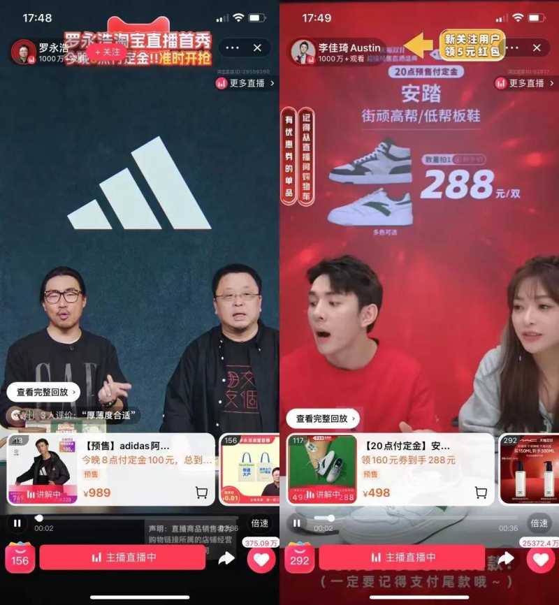 而随着李佳琦回归,罗永浩开始在淘宝直播,全网热议的二人在直播间也卖起了运动品牌,安踏、FILA、阿迪达斯乃至罗永浩自“重新加载”复刻运动鞋均在直播间中出现。