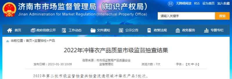 中国质量新闻网讯 2023年1月30日,济南市市场监督管理局网站发布2022年冲锋衣产品质量市级监督抽查结果。2022年第二批市级监督抽查共抽查流通领域冲锋衣产品5批次。