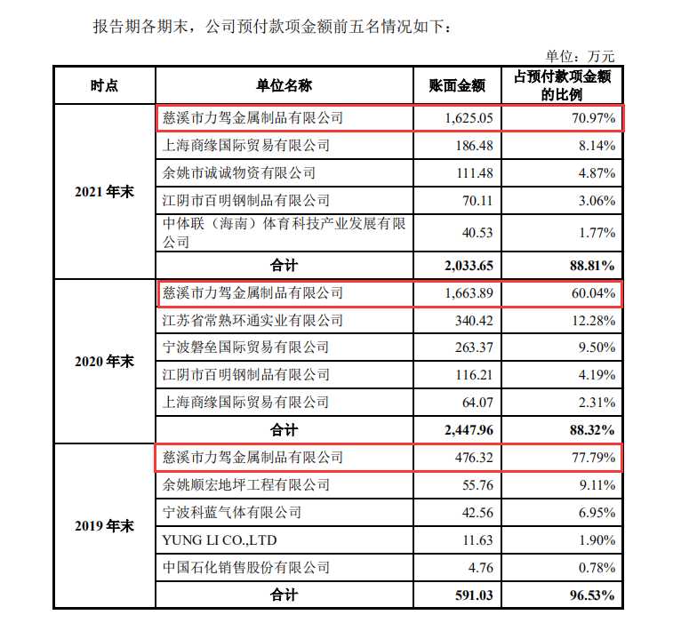 力玄运动披露,公司预付款项账龄基本在1年以内,这意味着力玄运动向所有供应商支付的预付款基本为当年新增,并非历史累积。以2021年预付款计算,力玄运动对力驾金属的预付款占当年对其采购金额的12.8%,而常熟环通几乎可以忽略不计。