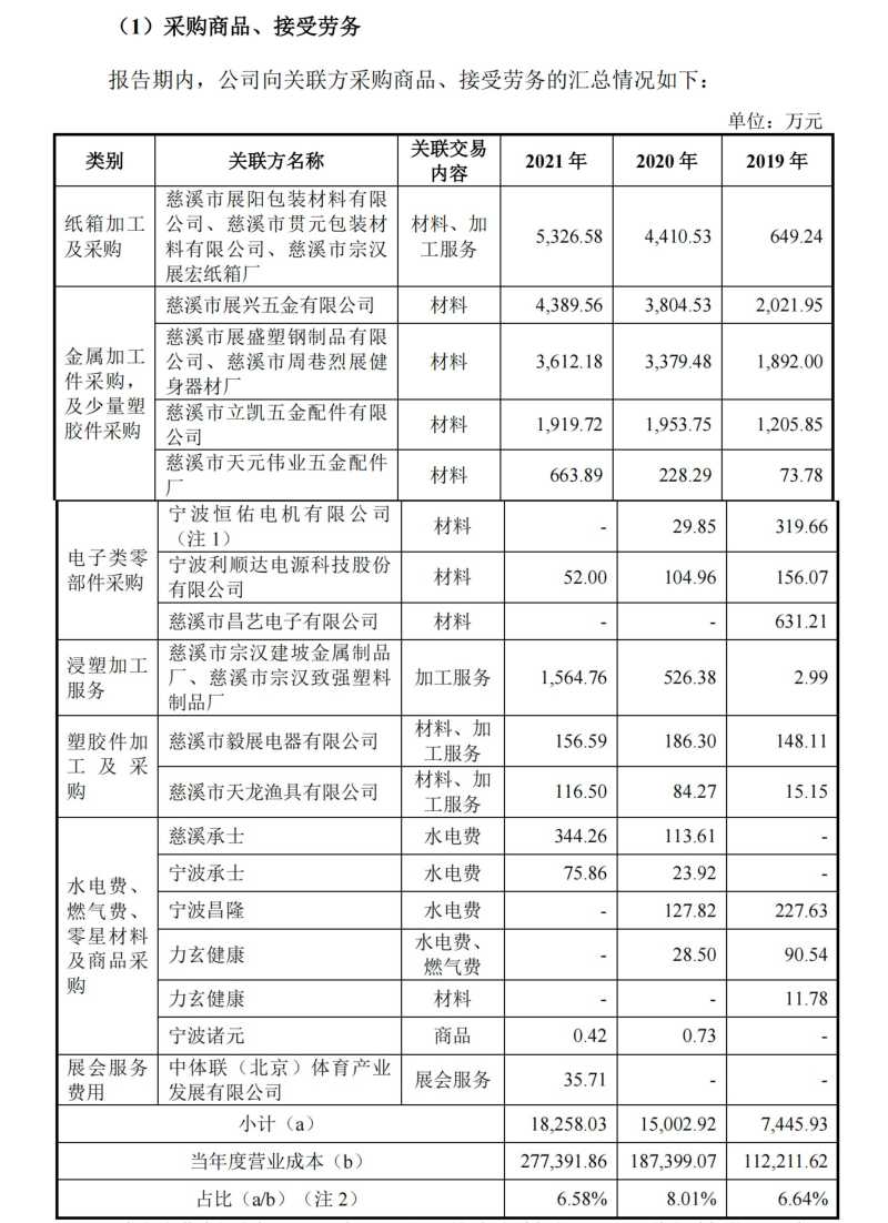 值得一提的是,上述关联供应商有部分专门为力玄运动服务。例如2021年,蒋志康控制的两家企业向力玄提供的外协服务金额占其收入比例就接近100%,张稚展控制的贯元包装和展宏纸箱厂的外协服务金额占其收入比例也接近100%,力玄运动也披露吴银昌的小舅子赵志开控制的慈溪市立凯五金配件有限公司“除发行人外不存在其他客户”。