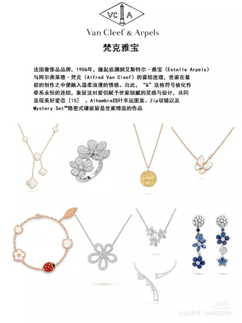 法国奢侈品品牌,1906年,缘起追溯到艾斯特尔•雅宝与阿尔弗莱德 •梵克 的喜结连理,世家在最初的创作之中便融入温柔浪漫的情感。自此,“&〞这枚符号被化作牵系永恒的连结,象征这对爱侣赋子世家细腻的灵感与设计,共同呈现美好爱恋,四叶幸运图案、Zip项链以及Mystery setm隐密式镶嵌皆是世家缔造的作品。