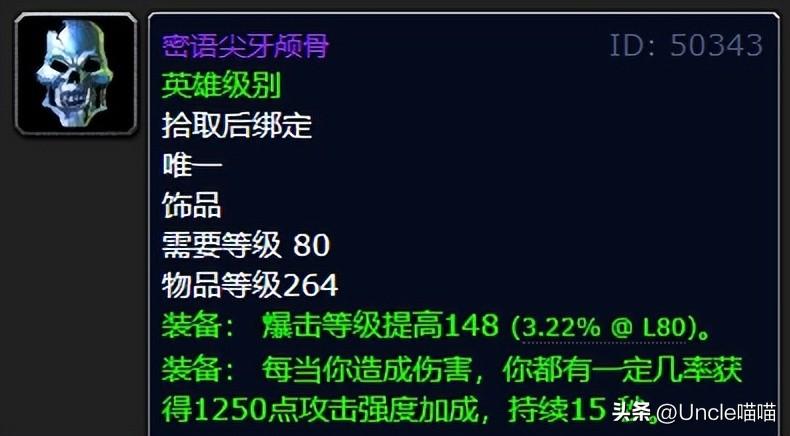 就亡语女士出品的密语尖牙颅骨来说,喵叔个人觉得物理系输出必然会抢破头的存在了,毕竟不仅高额爆击加持之下,还让你的伤害有机会获得1250点恐怖如斯的攻击强度提高持续时间更是长达15秒之久。