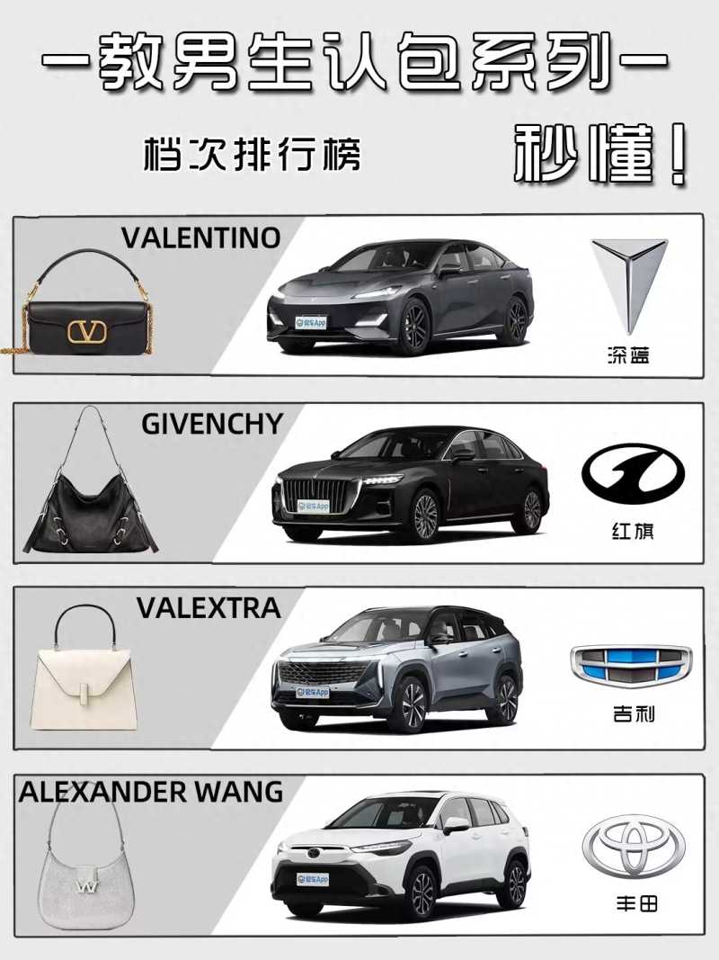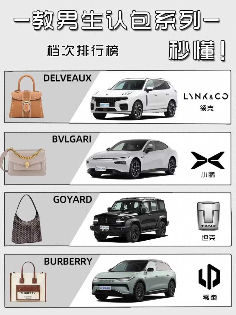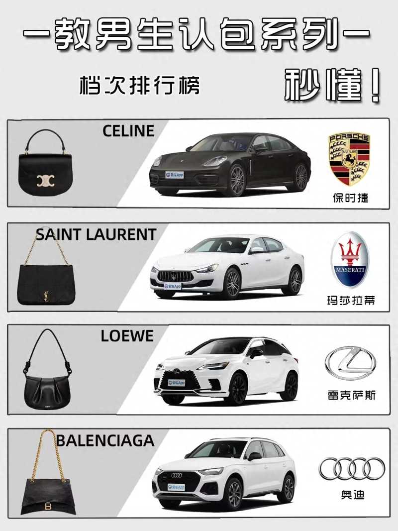 有人说女生爱包男生爱表不是没有道理的,因为这些奢侈品都湿各自的档次代表,那么如果用车来比喻奢侈品包包的档次,那么你觉得你的车对应哪个包包呢,一招教会男生认包系列