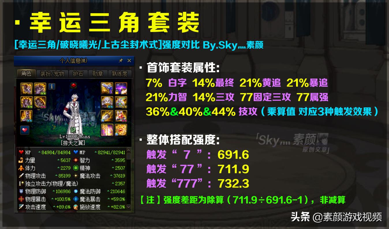根据套装触发效果的不同,[幸运三角]套装在本文装备模板下的强度分为三种:触发“7”的强度为691.6,触发“77”的强度为711.9,触发“777”的强度为732.3(强度数值之间的差距为除算,非减算)。