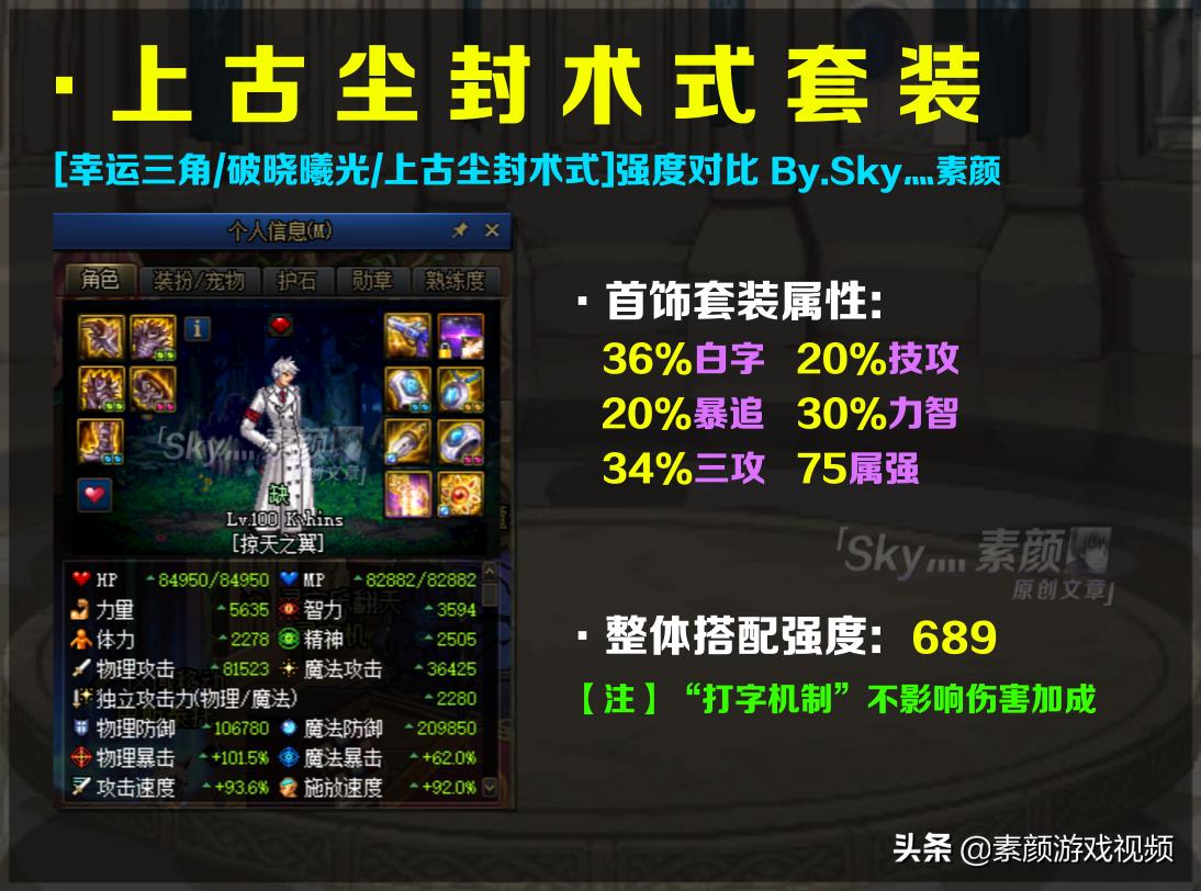 [上古尘封术式]套装的效果都比较固定,没什么浮动值,所以强度数值也就比较固定了。在本文的装备模板下,[上古尘封术式]套装的强度为689。要注意的是,因为武器模板用的是[夜语黑瞳武器],此武器的属性词条仅为技能攻击力和最终伤害,且最终伤害的加成数值较高,而[上古尘封术式]套装的最终伤害数值为0;所以选用此武器模板,对[上古尘封术式]套装来说有一些属性基数方面的优势(但基本不会影响三套首饰的强弱关系)。