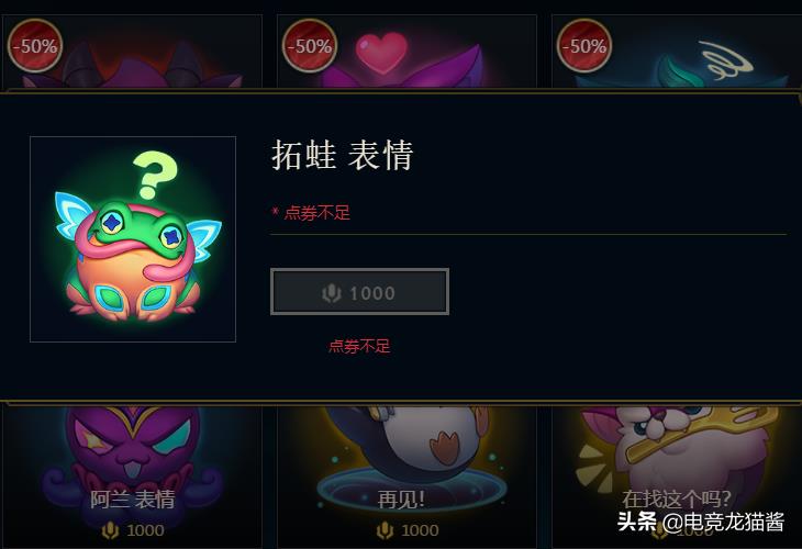 首先是拓蛙,这个表情相信经常看LOL比赛的朋友并不陌生,不少职业选手都非常喜欢亮这个表情,尤其是当对手或者队友出现奇怪操作,亦或者是场上出现不合理现象,比如今年LPL春季赛就有个牛头飞上了天,使得双方选手都亮了拓蛙表情,引得解说和观众捧腹大笑。拓蛙这表情,绝对是实战中的“利器”,而现在半价期间,却只要1000点券,买了就血赚。
