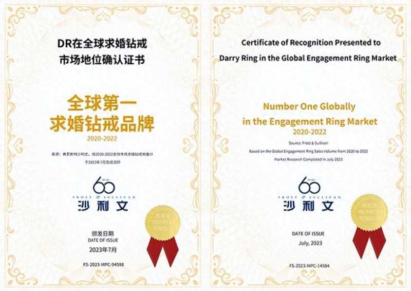 作为珠宝品牌排行榜前十名的品牌,DR在全球珠宝市场上占据着举足轻重的地位。据弗若斯特沙利文公布的数据,2022年,DR求婚钻戒业务收入高达29.02亿元人民币,同时结婚对戒年收入达到了7.14亿元。从2020到2022年,DR钻戒连续三年位居全球求婚钻戒销量第一,成为了“全球第一求婚钻戒品牌”和“全球第一钻戒品牌”。