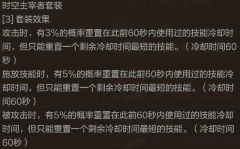时空主宰者套装有概率重置此前60秒内使用的技能冷却时间,但只能重置一个剩余冷却时间最短的技能,攻击、施放技能和被攻击都有概率触发,这个效果其实有些鸡肋。另外套装还附带3%攻速和5%施放速度,小号集齐水抗魔是很好的选择。