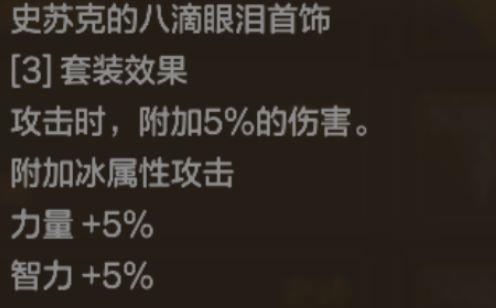 八滴泪套装中单件收益最大的是手镯,三滴泪手镯的效果是冰强+10,想堆冰强的玩家可以单独用手镯再搭配其他散件。