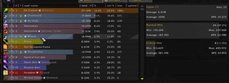 首先的第一要务是尽量站得离Boss靠近一些,这样就可以让小蜡友们不浪费来回跑的时间,让它们的所有技能最大化输出。另一方面,这些小蜡友还受到种族技能和天赋的加成,例如兽人的【命令】增加宠物伤害1%,恶魔术士的天赋【恶魔学识大师】增加宠物12%的伤害等等。我们来看看一位近战恶魔术的伤害构成,他召唤出来的小蜡友维恩造成了高达6.9%的伤害占比!