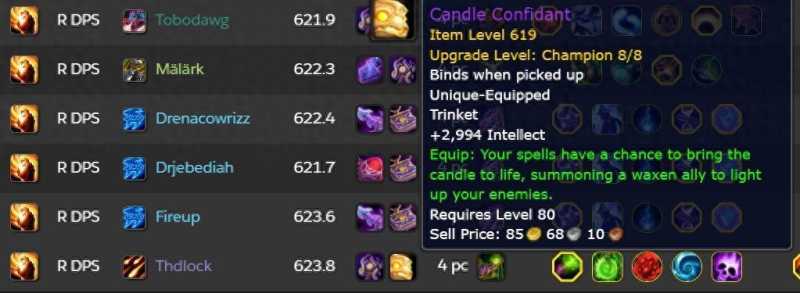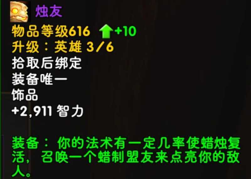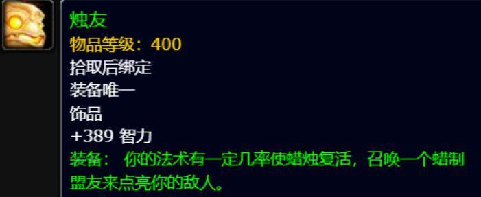 这个饰品的名字叫做【烛友】,由地下堡产出,属性非常强,但是获取难度很低,只要打地下堡就能获得。这个饰品最多可以提升到619的装等,但是价值却高于大多数装等更高的装备,对于大多数专精而言,它的价值相当于632的【无羁拟态者】。