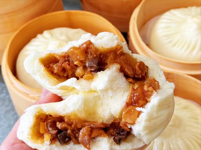 做好的三丁包,洁白暄软,咬上一口,馅料鲜香醇厚,色泽红亮,鲜嫩的鸡丁、油润的肉丁、清脆的笋丁在口中交织。