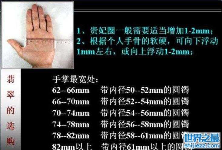 例如:左手量出16.8cm(168mm),除0.314后,即可确定适合配戴内圈53.5mm的手镯。需要略松或略紧,前后可加减1-2cm,就是你的手寸实际大小,手镯的尺寸。由于翡翠贵妃镯椭的程度不一样,并不是你带54的圆镯你就能带内径长边为54的贵妃手镯。(一般情况下应加1-2mm以方便手镯佩戴,老年人、手骨节较大较硬的人应加3-4mm)。