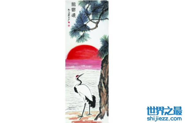 《祖国颂》将太阳、青松、仙鹤与水面融合在一起,细节处理的非常精致,这是齐白石大写花鸟画中的一幅力作,也是齐白石晚年的重要作品之一,在北京保利举办的拍卖会上以7200万多高价卖出。