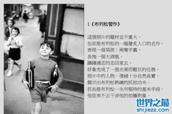 《布列松习作》是一幅非常脍炙人口的作品,照片讲述的是一个男孩,两手各抱一个大酒瓶回家,脸上表情非常满足,像完成了一项光荣的任务一样,人物情绪非常自然真实。也是全球十大摄影作品之一。