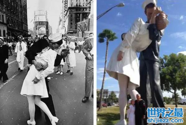 这幅作品是在1945年日本宣布投降,纽约的人民纷纷走上街头庆祝胜利,在这样热烈的氛围之下一位士兵轻吻了身边的一位女护士,被摄影师抓拍下来,成就了这样的传世经典。在那之后有不少情侣在时代广场重现胜利之吻,以此来纪念二战结束。